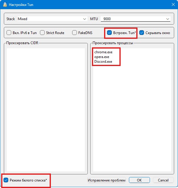 Если необходимо проксировать только некоторые процессы, запущенные на компьютере, то можно настроить TUN-режим таким образом, чтобы сформировать «белые списки».