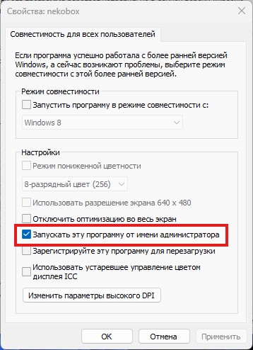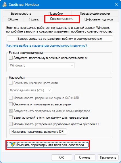 Далее переходим во вкладку Совместимость, после чего нажимаем кнопку Изменить параметры для всех пользователей и ставим галочку Запускать эту программу от имени администратора.