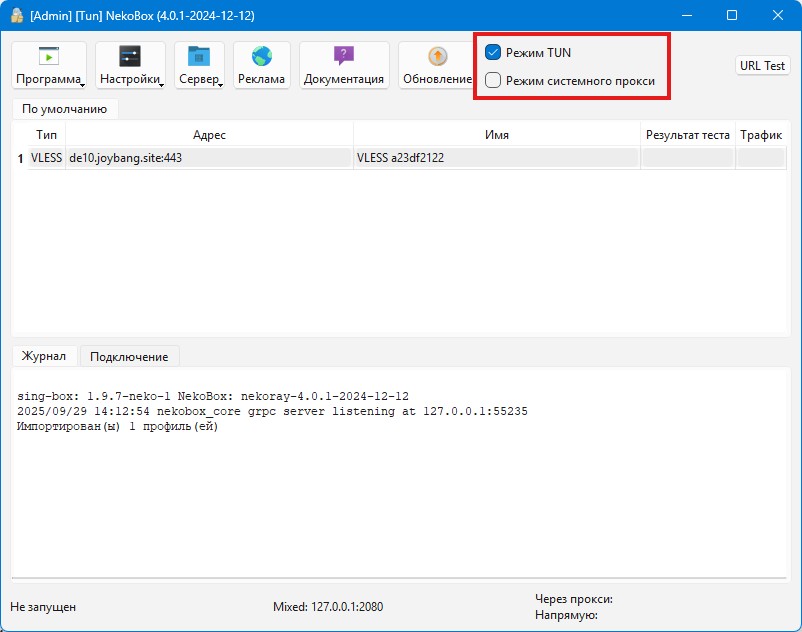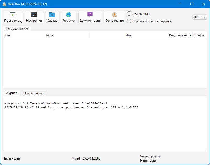 Теперь Nekobox настроен и проксирует все соединения (в режиме Tun). В некоторых случаях необходимо подождать некоторое время, пока все туннели будут настроены и программа начнет полноценно функционировать.