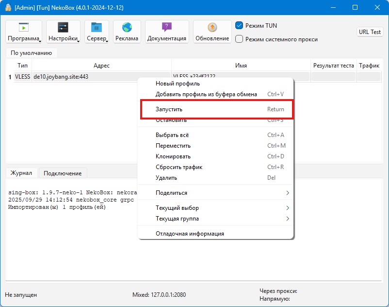 4. Активация режима TUN и запуск профиля