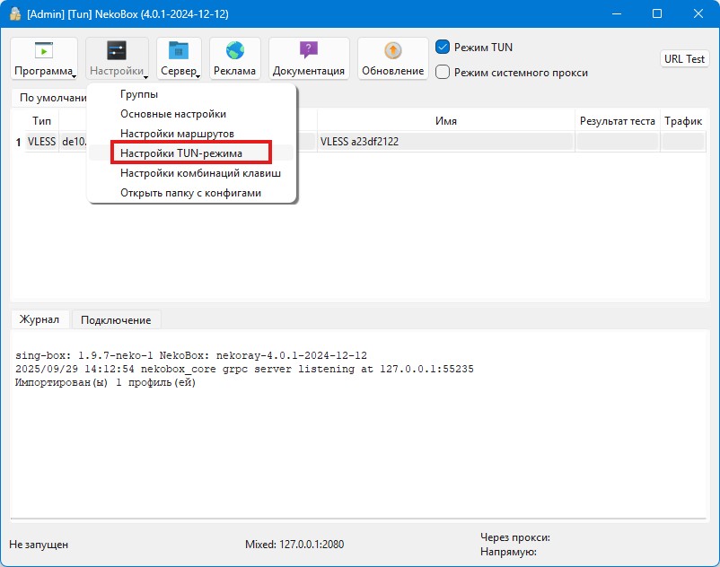 Переходим в меню Настройки — Настройки TUN-режима